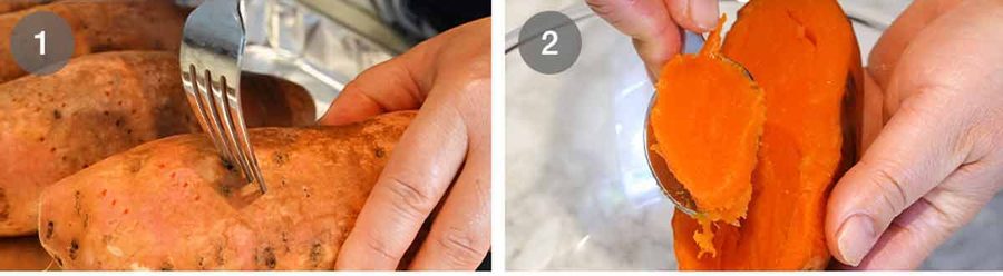 Scoop – Let it cool for 10 minutes just so you can handle it. Then cut in half and scoop the flesh out, using a tea towel to hold the potato if needed.