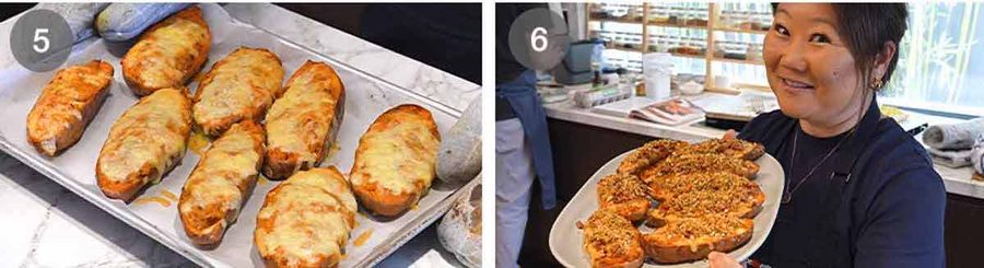- Stuff – Place halved sweet potato back on a paper lined baking tray and stuff them equally with filling. Sprinkle with leftover cheese and bake for 25 minutes until cheese is melted.