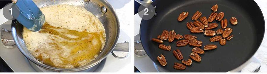 - Toast pecans – Heat a non-stick pan over medium high heat. Add pecans and toast for 2 to 3 minutes until they have golden spots. Transfer to cutting board, cool then finely chop.