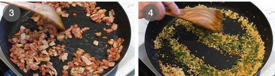 Crunchy panko – Add the panko, sage and salt. Then cook for a few minutes in the bacon fat until the panko is golden.