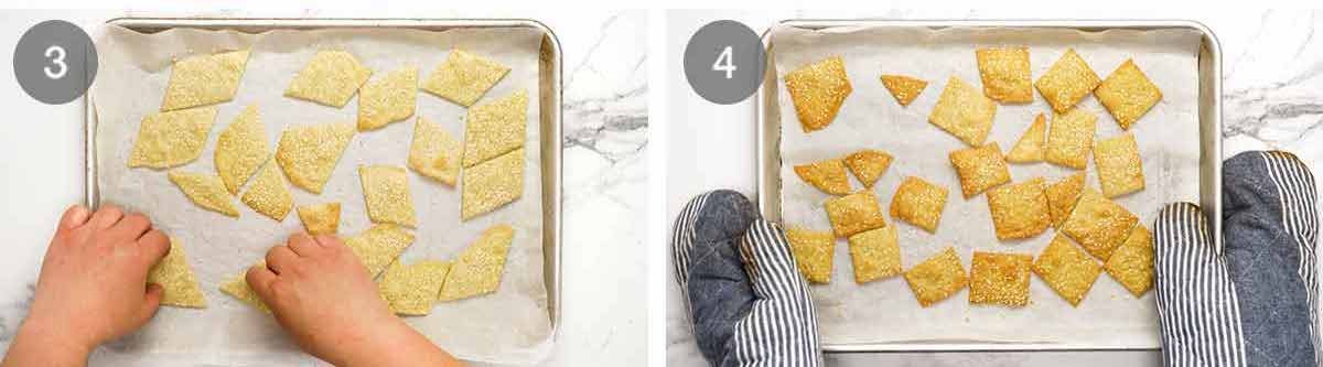 - Mix dry ingredients, make well, stir in wet. Divide in half, roll out 3mm / 1/8" thick. Transfer to paper, sprinkle with sesame and flakes, roll to 2mm / 1/12". Cut into 5cm / 2" pieces, transfer to tray, spray with oil. Bake 12 min, rearrange to colour evenly, bake 8 to 10 min until light golden.