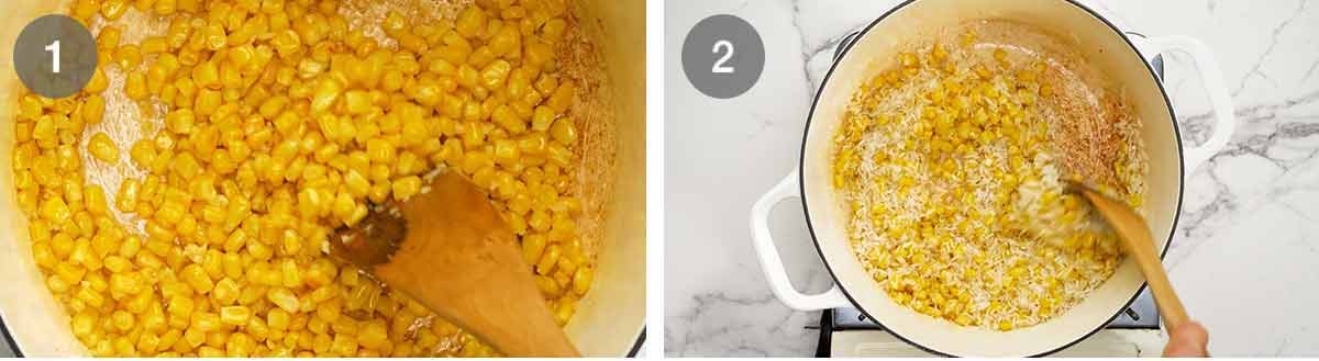 - Sauté – Melt half the butter in a pot over high heat. Add the garlic and stir for 15 seconds. Add the corn and half the salt. Stir for 2 minutes.