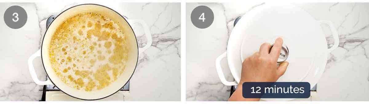 - Cook for 12 minutes (no peeking, no stirring!). The liquid should be absorbed by now – tilt the pot and take a quick peek to check.