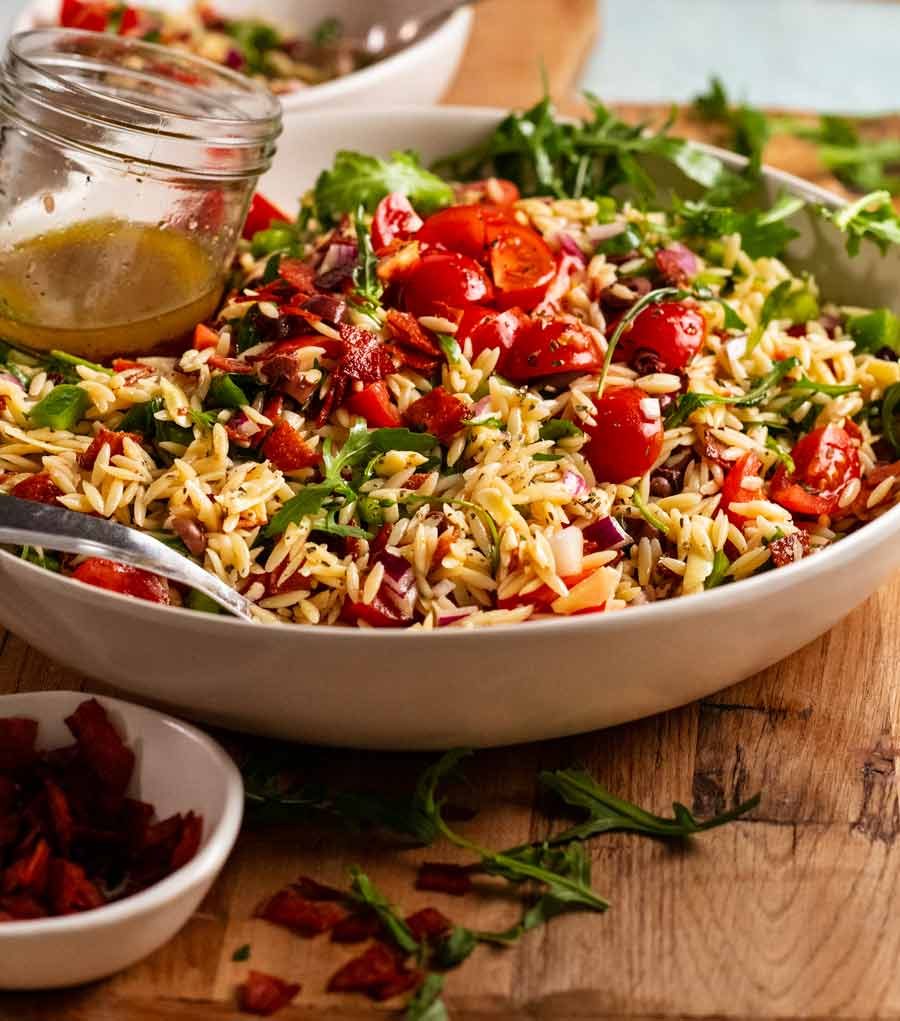 Risoni /orzo salad, filled with an unapologetically generous amount of your new favourite garnish – crispy salami bits! There’s a good stack of bright fresh vegetables in here too, all tossed up in a tasty Italian Dressing. A new big, bold, statement pasta salad to fall in love with!