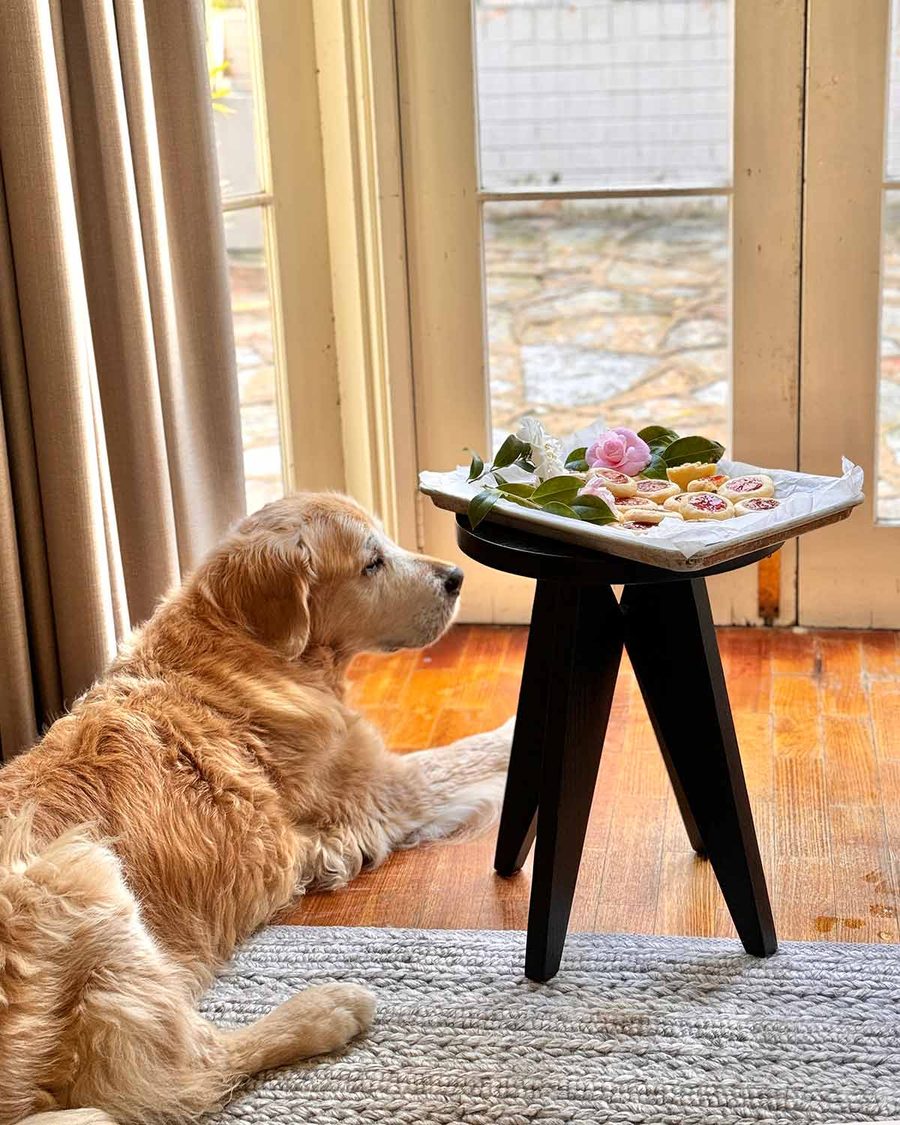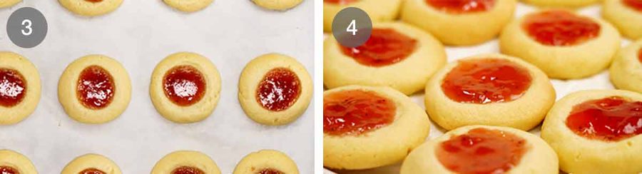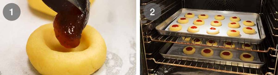 Fill the indent of each cookie with jam. Make sure the jam is nice and loose so it oozes into the dent rather than sitting upright in a stiff dollop (which mightn’t properly spread in the oven).