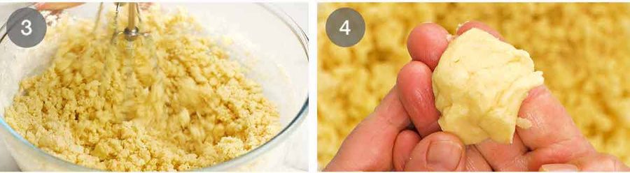 Crumbly dough – The mixture will be crumbly but if you grab a bit, you will see that it presses together into a dough.