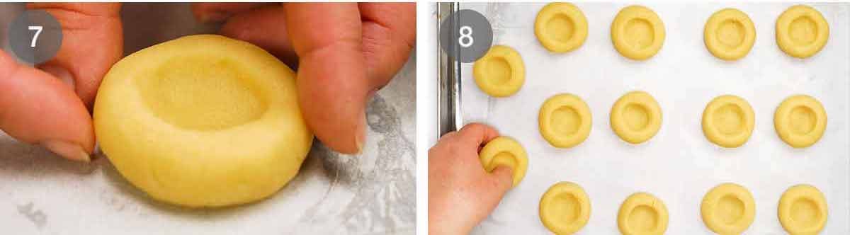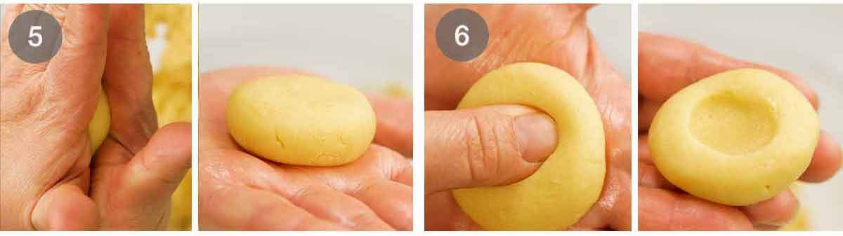 Indent the cookie using your thumb. (Thumbprint cookies!) My dents are probably a little more generous in width than most, to hold more jam (most recipes seem to use around 1/4 teaspoon per cookie, I use 1/2 heaped teaspoon).