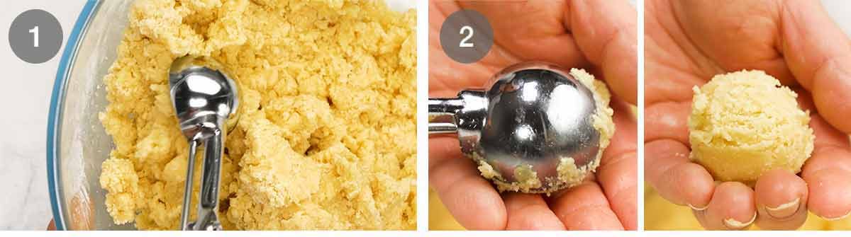 Measure – Tightly pack a 1 tablespoon measure or a size 60 cookie scoop (15 ml / 0.5 oz) with the crumbly dough, very slightly mounded rather than absolutely flat.