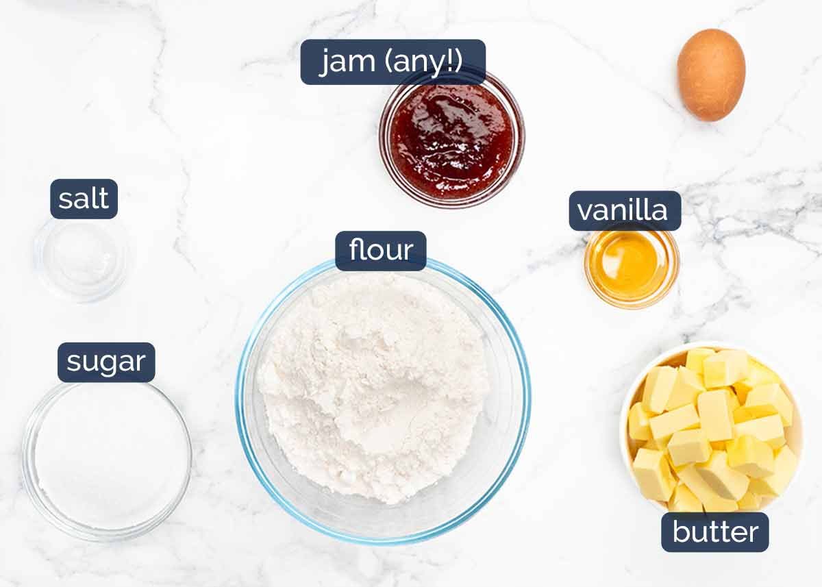 Here’s what you need to make Jam Drops. The cookie is a cross between melt-in-your-mouth buttery shortbread cookies and classic vanilla biscuits. I blend the two because I feel like shortbread cookies are a little too sandy-crumbly for this shape of cookie, whereas vanilla cookies are a little crisper than what I want.