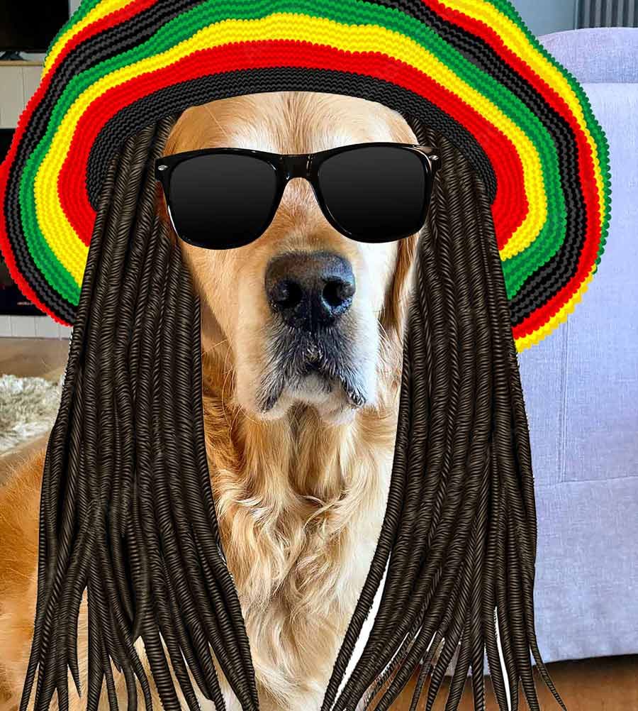 PS It’s totally photoshopped. Just couldn’t find a Jamaican dog costume, strangely. 😂