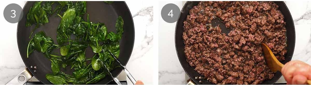 - Wilt spinach – Heat the 2 teaspoons of oil in a large non-stick pan over high heat. Add half the spinach, toss with tongs until semi wilted (~30 sec), then add the rest. Toss until wilted (~ 1 minute) then remove into a bowl.