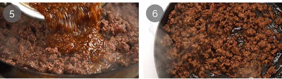 - Cook Bulgogi beef – Add 1 tablespoon oil to the pan. Still on high heat, add the beef and cook, breaking it up as you go, until you no longer see raw beef. Add the Bulgogi sauce, then let it simmer rapidly, stirring every now and then, until the sauce is mostly evaporated. Then stir regularly until the beef gets a bit of lovely caramelisation on it, but is still moist from the sauce.