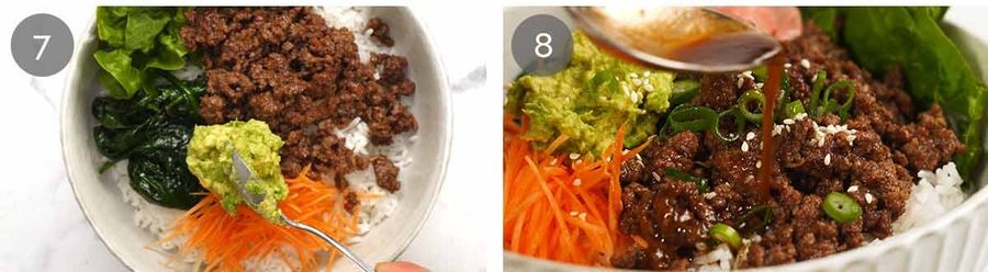 - Assemble – Spoon beef over rice, place spinach and carrot. Top with pickled ginger and a dollop of mashed avocado. Tuck lettuce down the side. Sprinkle with sesame seeds and green onion. Serve with sauce for drizzling all over everything before jumbling it all up and digging in!