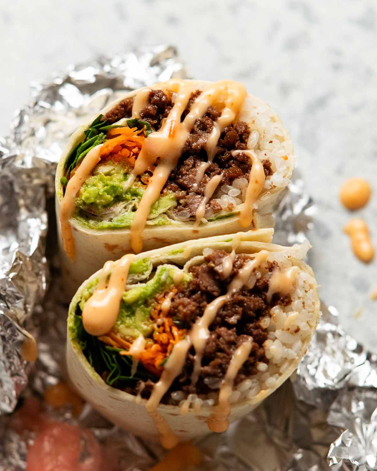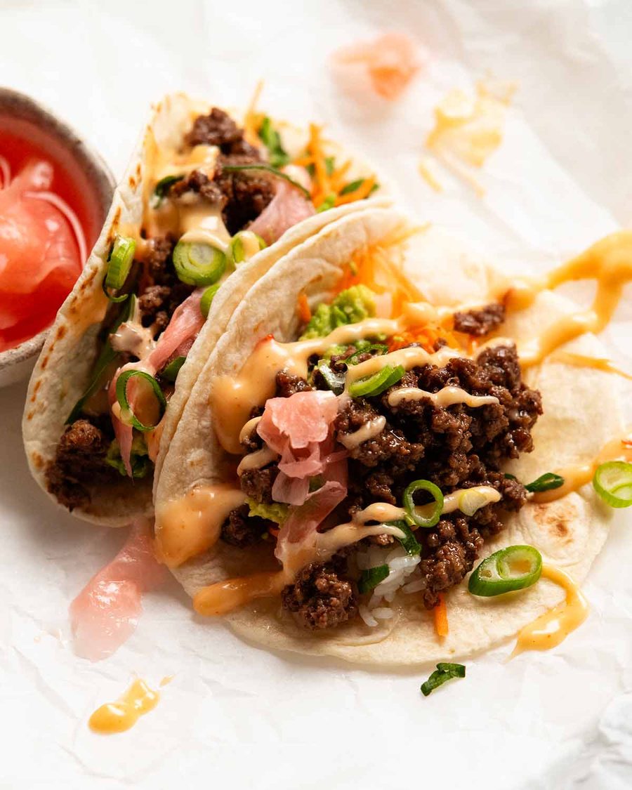 My favourite way is in tacos and burritos: Stuff/roll with rice and any of the rice toppings listed. I’d serve with a slightly spicy creamy sauce (mix gochujang or sriracha with mayonnaise) rather than the rice bowl drizzle sauce (which is thin). Here’s what they look like – and yes, they taste as good as they look!