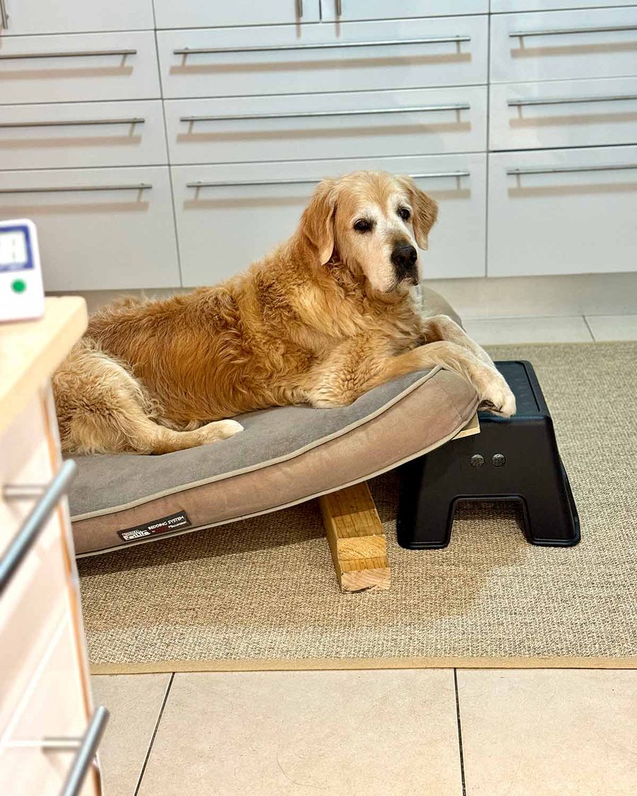 Oh, and a snap from this morning on his Digestion Bed on which he perches for 30 minutes after every meal, set on an incline to coax food does his throat. He’s very comfortable on it these days! And why wouldn’t he be? I wouldn’t complain if someone told me I had to lounge on a soft bed after every meal!
