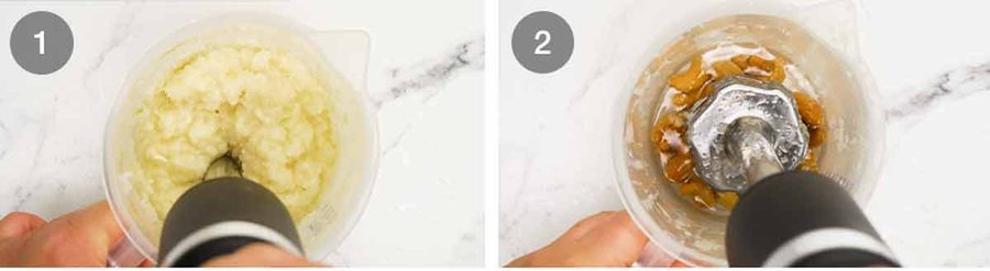 - Cashew puree – In the same jar, while covering the mouth of the jar with your hand (to prevent flying cashew comets), blitz the cashews and water with the stick blender until smooth, about 10 seconds. , Set aside.