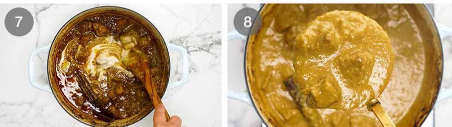 - Slow cook – Cook for 1 1/2 hours. Stir in Cashew Puree, put the lid back on then return to the oven for another 30 minutes. The sauce should have thickened to a creamy consistency and lamb should be tender end to pull apart with forks with no effort. (Note 6)