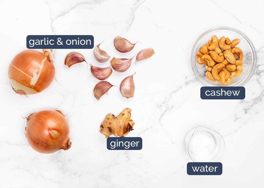 A stick blender is your friend here! Makes the pureeing of the onion and cashews a breeze. 🙂 While the onion can be pureed in a food processor, you will struggle with the cashews unless you have a small one because there isn’t enough volume.
