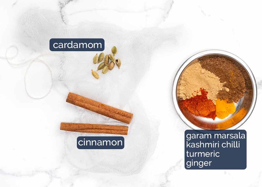 - 10 cardamom pods (green), lightly crushed, wrapped and tied in muslin or cheesecloth (Note 5)