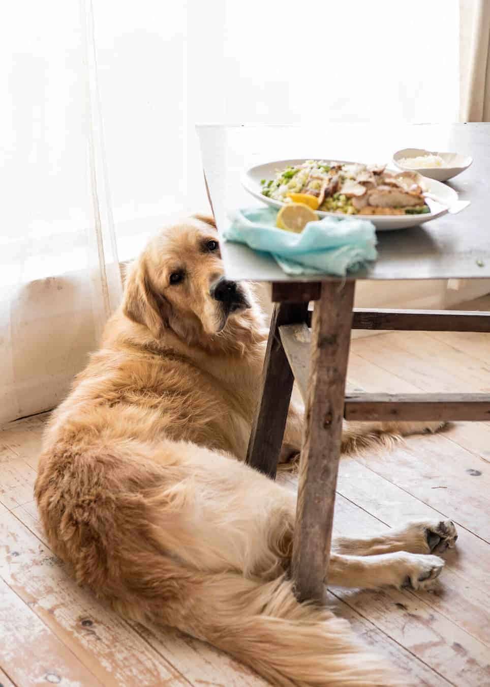 Dozer is waiting so patiently for a taste of the yummy looking chicken. Either that or you were holding a big T-Bone steak in your other hand to get his attention while taking the picture. Either way, a great shot.