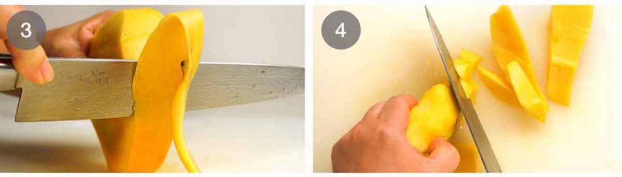 Cheeks first – Stand the mango upright on the wider side (ie the side that was attached to the tree). Cut the cheek of the mango off each side of the seed, aiming to leave as little flesh as possible on the seed.