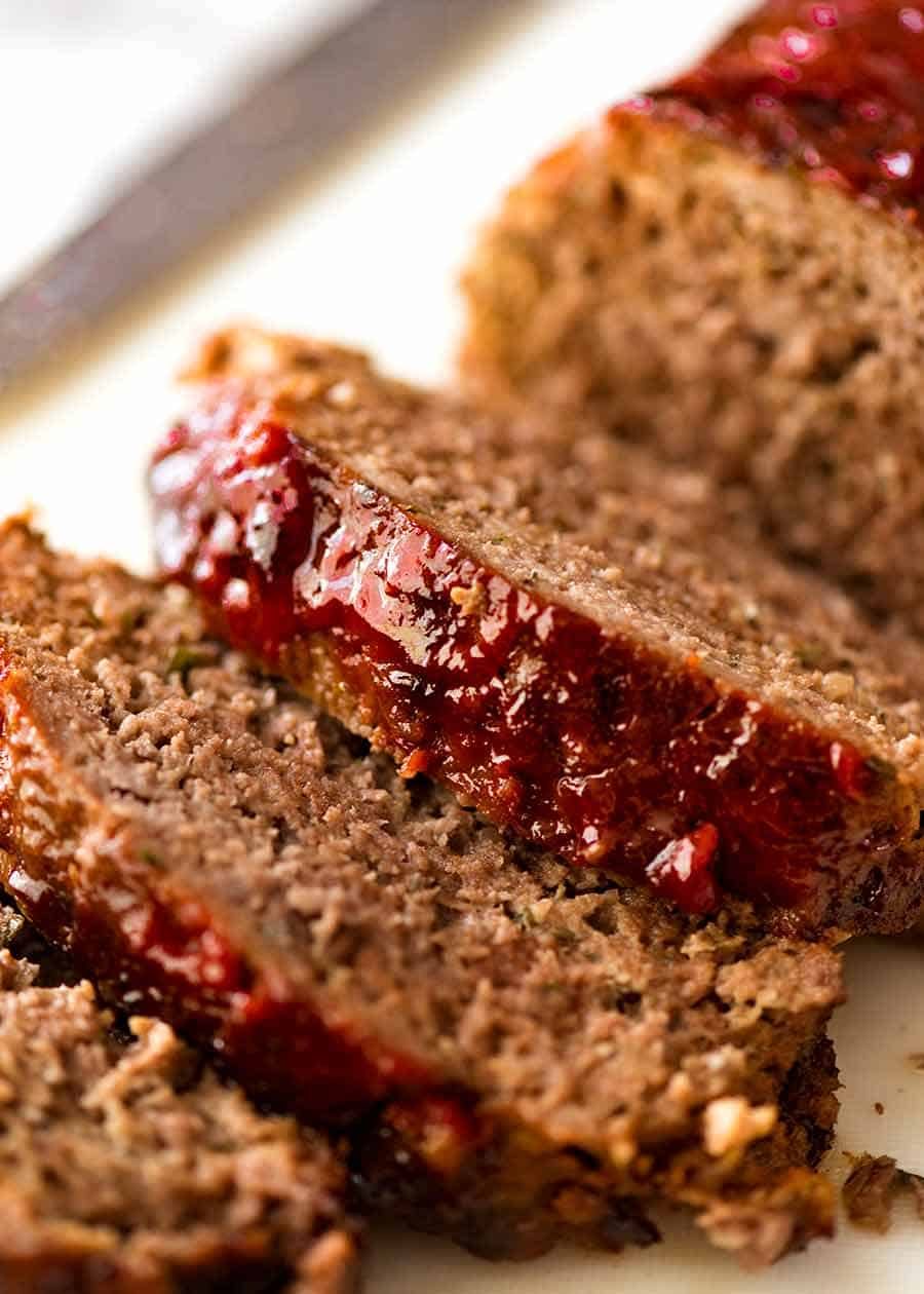 This is a Meatloaf recipe for people who love their Meatloaf oozing with flavour, moist and tender yet not crumble apart when sliced, and a sticky caramelised meatloaf glaze . It’s so much more than just a giant hunk of ground beef in a loaf shape!