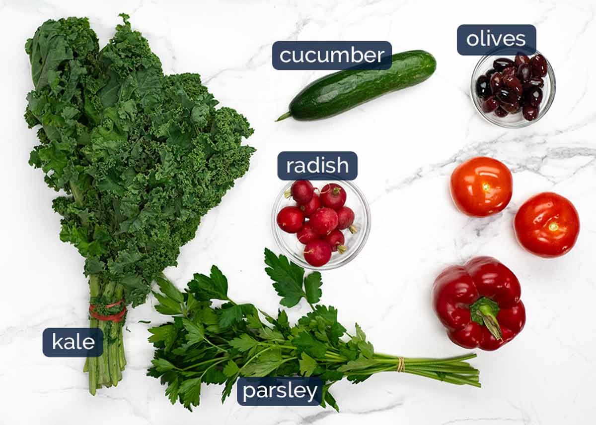 Kalamata olives – Whole pitted olives that we will cut into four pieces. I like doing that because you get these little juicy briny bits of olives littered throughout the salad. Pre-sliced olives don’t have quite the same meaty little bite to it, though you can absolutely use it for convenience.