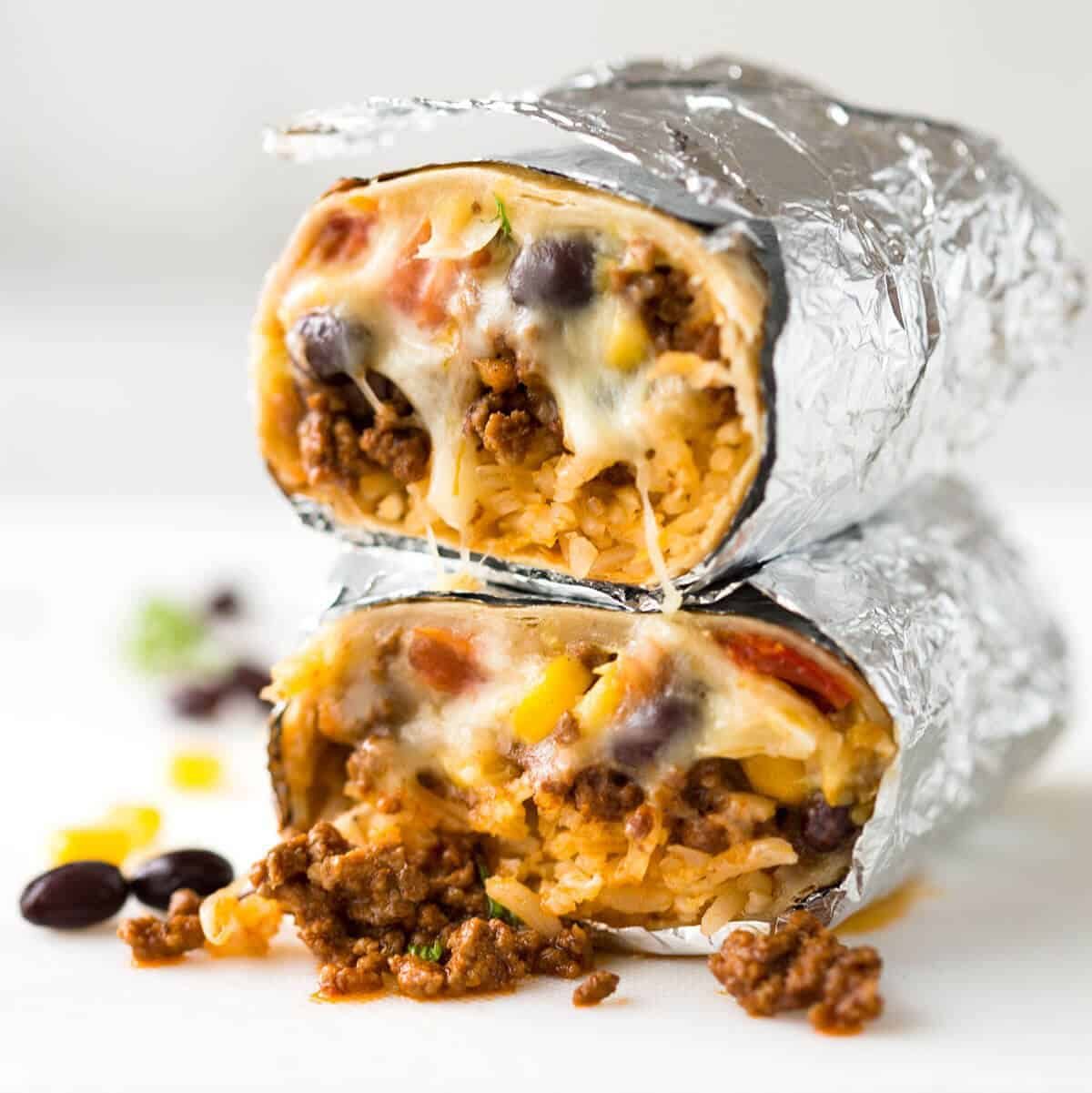 Or use it to stuff into Burritos. Now, I must confess in the burritos pictured below, I just used plain rice! The beef in these burritos stained the rice red. 🙂 (PS These are freezer friendly, they are brilliant standby meals).