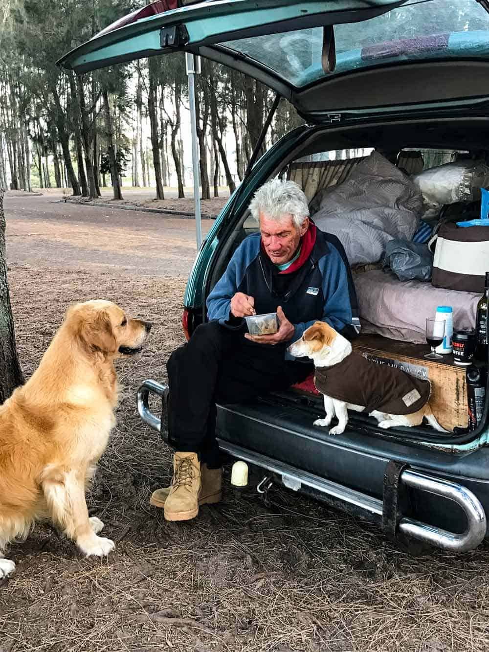 This is Geoff, the homeless man who I take hot meals to who you’ve been hearing about for years. His car is his home, and he has special permission from the Council to stay at the dog park. He tells the worst jokes (😂), he seems to know everyone – and their dogs – by name and we always joke that he has the best backyard in the northern beaches: barrel gun views over the beautiful Pittwater waterway.