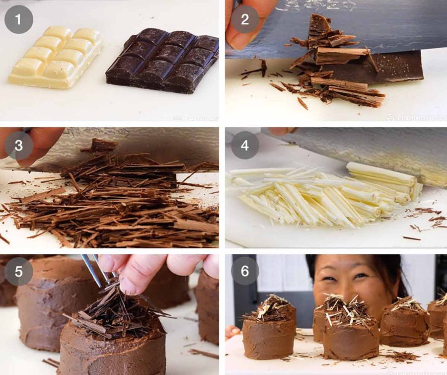 Decorate as you please! The easiest would be a dusting of cocoa or icing sugar / powdered sugar, or colourful sprinkles for cheerful mini birthday cakes. Pictured in post are chocolate shavings. Here’s how to do them: