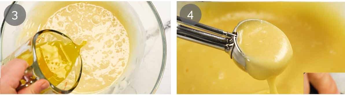 - Wet ingredients – In a separate medium bowl, whisk the eggs and sugar vigorously for 20 seconds until pale yellow. Add oil, milk and vanilla and whisk again.