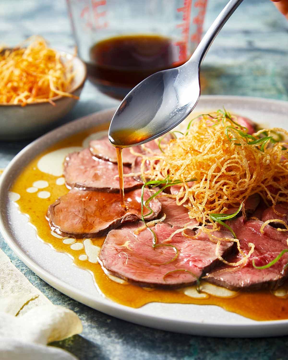 The beef actually needs to be cooked a few hours beforehand (or the morning of) and can be sliced and laid out ahead of time. The crispy potato straws can be made up to 5 days ahead (they stay 100% crispy, and I guarantee you will be eating these by the fistful), the sauce can be made the morning of and the garlic oil can be made up to 3 days prior.