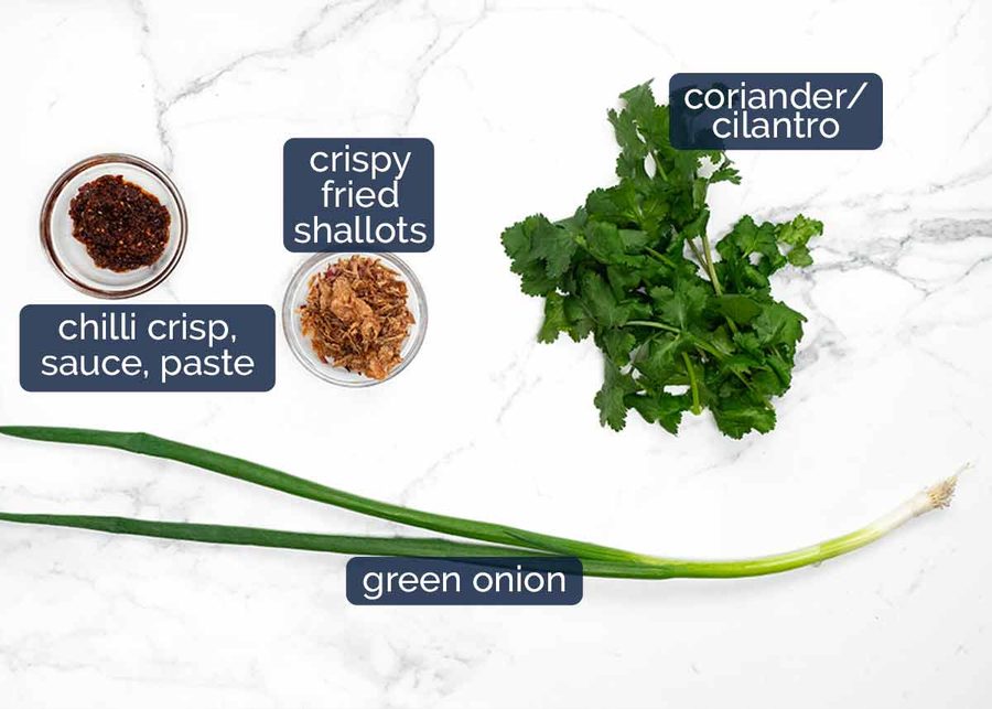 Toppings – Mound the coriander on top, sprinkle with green onions and a generous amount of crispy fried shallots. Dollop as much or as little chilli crisp as you want/dare. Then dig in!