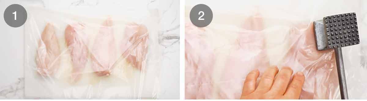 Cover the chicken breast with go-between, a freezer bag or double layer of cling wrap, to protect it from tearing when you pound.