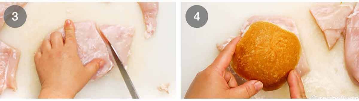 - Prepare chicken breast – If using breast, pound to 1 cm / 0.4" even thickness (cover with go-between or freezer bags, use a meat mallet or rolling pin). Then trim each chicken piece so it is a bit larger than the buns (factor in 20% shrinkage when it cooks).