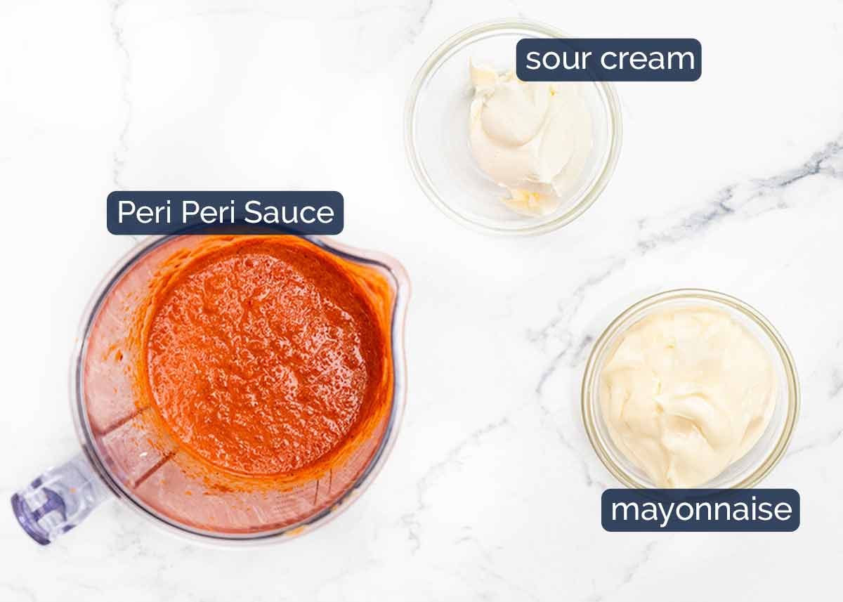 Peri-naise sauce – Use 3 tablespoons of the Peri Peri Sauce and mix it with the sour cream and mayonnaise to make the Per-naise.