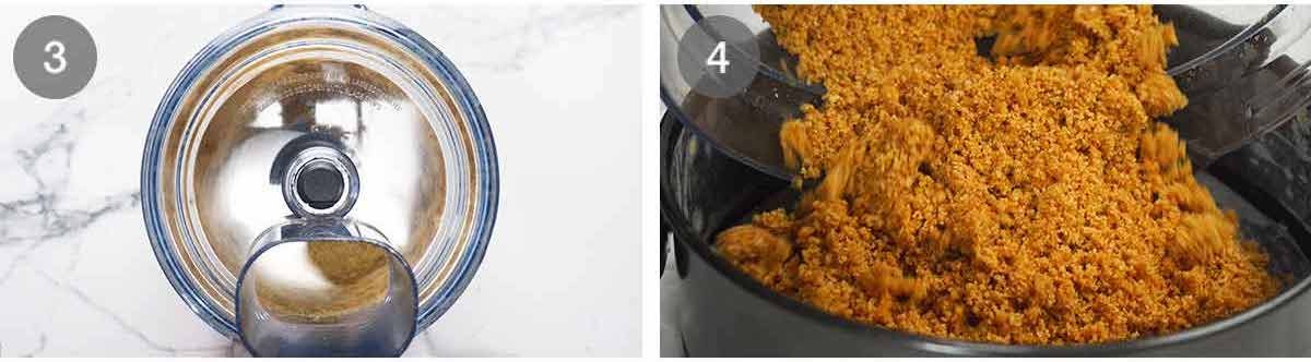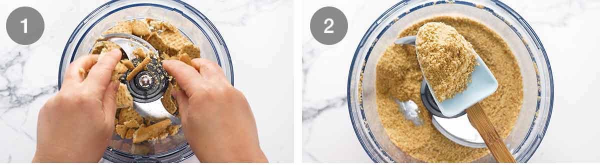 - Blitz β Break up biscuits roughly by hand and place in a food processor. Blitz until it becomes fine crumbs (~30 seconds).