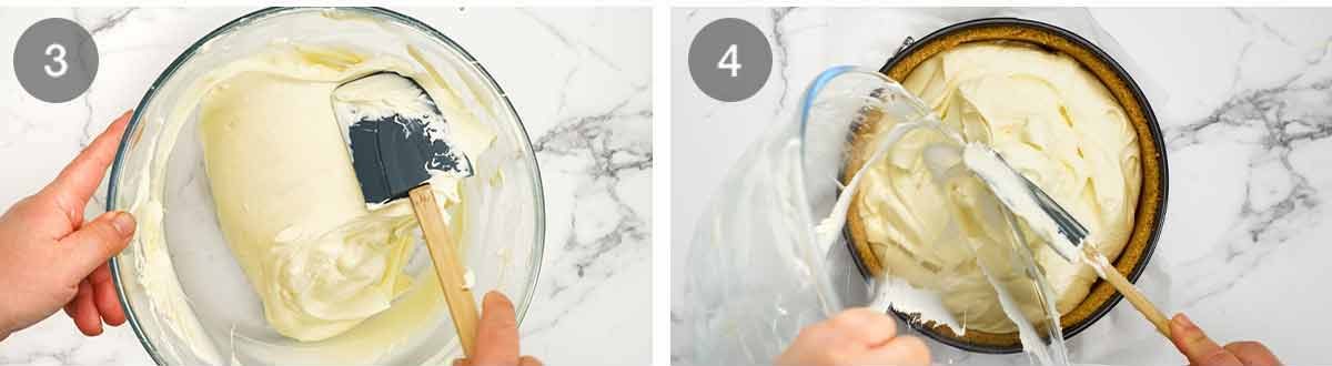 Once the initial cream is mostly mixed through, gently mix through the remaining cream. Donβt stir vigorously as you will knock air out of the whipped cream which will make the cheesecake filling denser than we are aiming for!