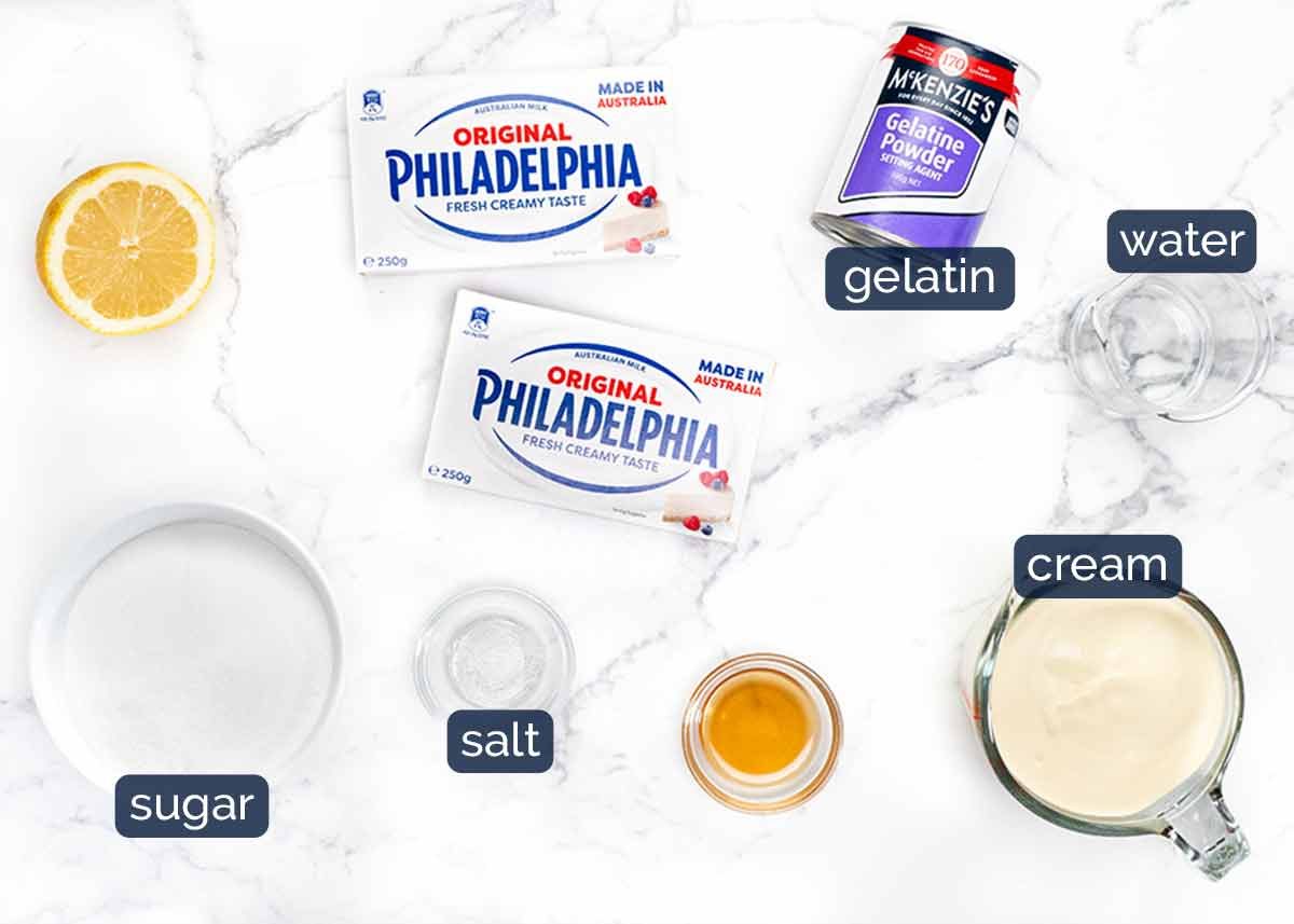 Blocks not tubs β This recipe calls for cream cheese blocks which are firmer than cream cheese in tubs which are softer as they are designed for spreading. If you can only get tubs, you just need to use a little more gelatine. See notes in the recipe card for quantity.