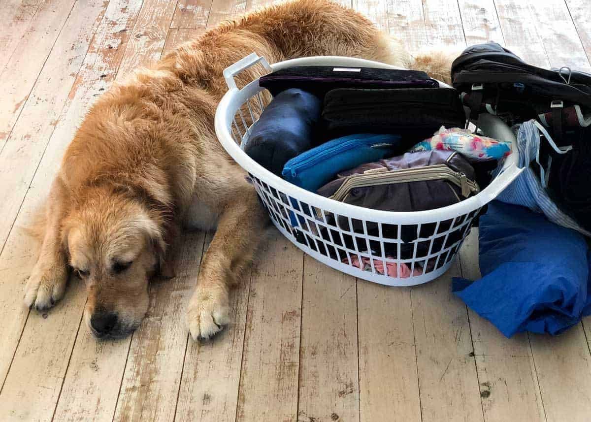 The sight of a suitcase always distresses him. So I tried to trick him by piling up my luggage in a washing basket, planning to throw it into a suitcase at the last minute. Just so I wouldn’t have to deal with his forlorn face all night.