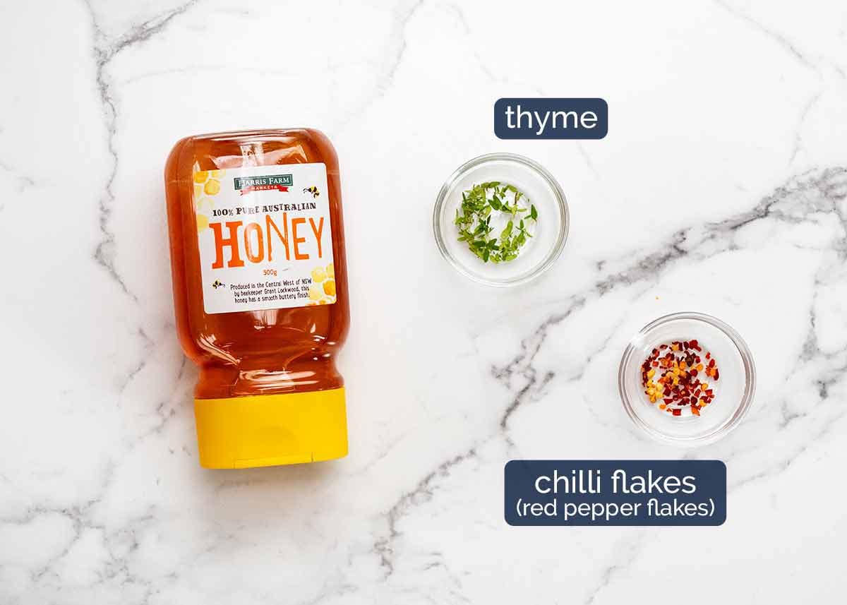 - Optional finishes – Working quickly, drizzle with honey, sprinkle with thyme and chilli flakes. I do full honey coverage for some slices, and for others just a drizzle.