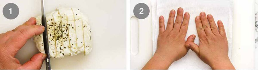 - Cut halloumi into 1-1.25 cm thick slices (0.4 – 0.5") (see Note 3). Place the slices on a paper towel and pat the surface dry.