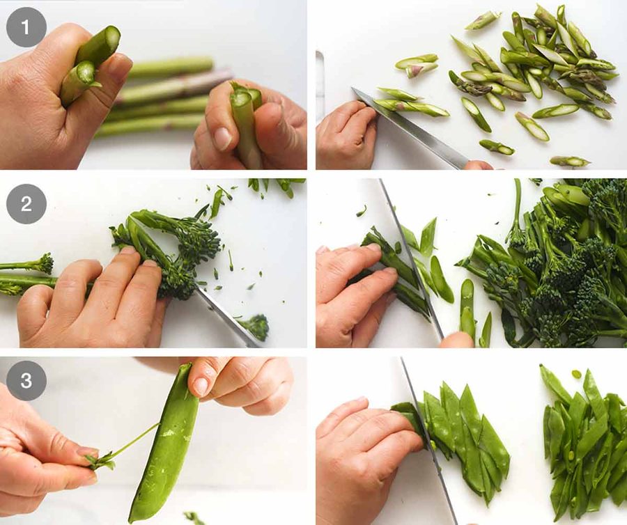 - Broccolini – Cut off florets then cut in half lengthwise. Then slice the stems diagonally into 2.5 cm / 1" lengths.