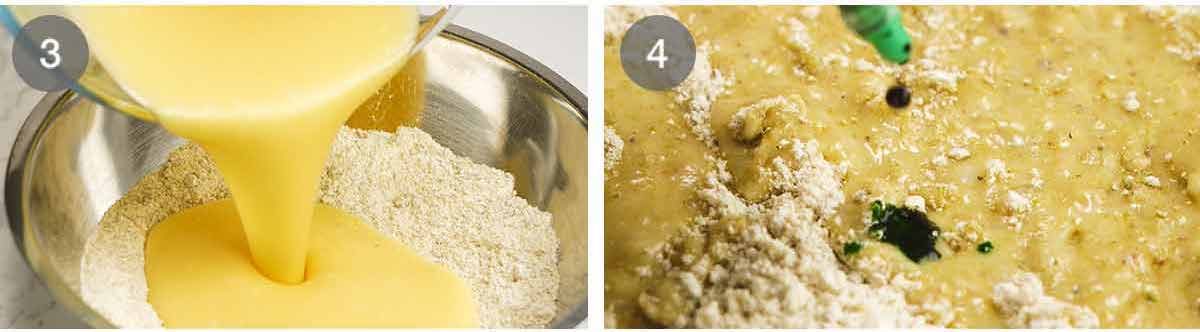 - Combine wet & dry – Pour the Wet into the Dry ingredients bowl. Use a rubber spatula to mix until the flour is almost mixed in.