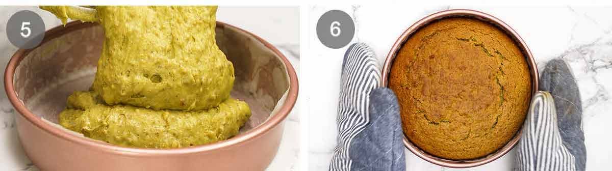 Make it pistachio green! Add 4 small drops of green food colouring and mix it in. Goal – pistachio green colour. (Note: the cake becomes slightly darker in colour once baked, see above for raw batter vs cooked cake comparison.) Then mix until the batter is fully combined. You may have some small lumps from pistachio powder clumps (these will dissolve in the oven) and a few random whole bits of pistachio.