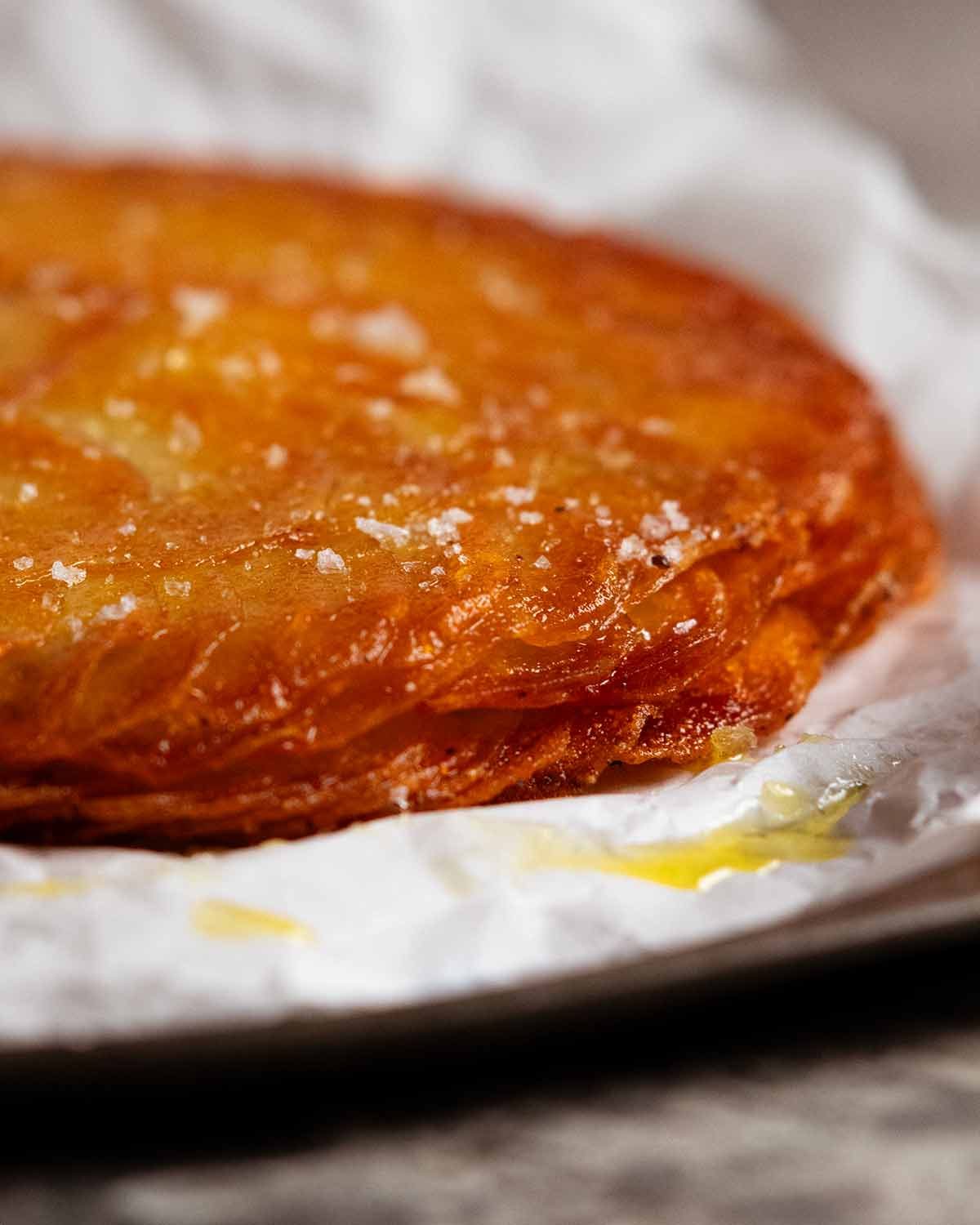 Here’s how to make Pommes Anna. Just thin slices of potato, lots of butter, a bit of patience, and you’ll get that beautiful French golden potato “layer cake” every time.