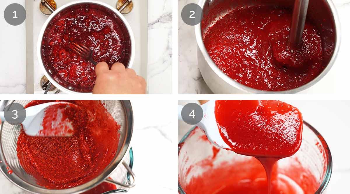 Here is how I make raspberry coulis. Some recipes do not call for simmering on the stove. I do, because it thicks the sauce so it becomes properly syrupy and clings to things better.