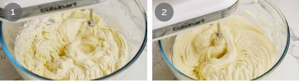 Beat cream cheese – Put the cream cheese and sugar in a separate bowl and using the same whisk (no need to clean it), beat for 2 minute on high just until it’s smooth and quite fluffy. Then add the melted cooled gelatine and vanilla, and beat until combined (~15 seconds).