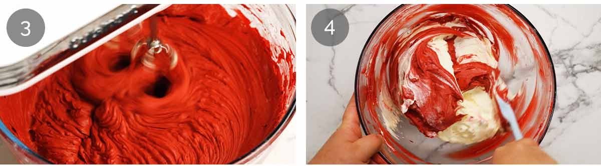 - Make it red! Add the lukewarm melted chocolate and red food colouring. Beat well for 1 minute until well combined. It should be a dark, seductive scarlet red colour rather than bright red, bearing in mind the cream will lighten it a bit.