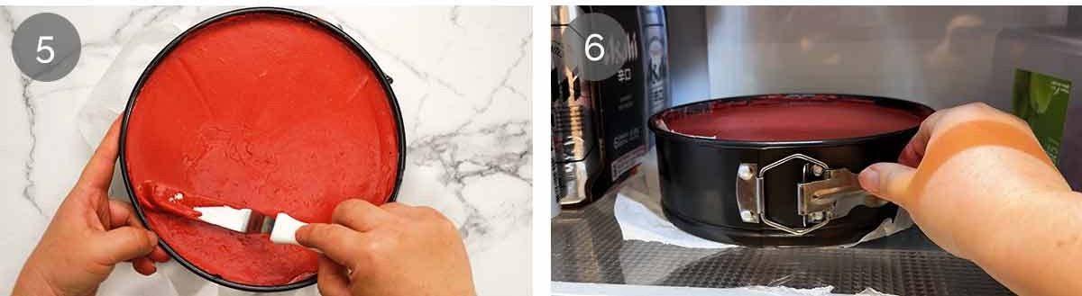Colour check – Whatever the colour the filling is at this stage, it will be slightly paler in the finished cheesecake after the cream is added. Feel free to add more red colouring if you like, but don’t add more chocolate because it will weigh the filling down too much and make it denser (I found 150g/5oz was the limit).